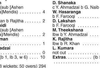 Najibullah Zadran made a quick fire knock of 42 in 25 balls and struck five fours and a six while Gulbadin Naib struck 22 in 24 balls was finally out in the 49th over which was bowled by newcomer Dhananjaya Lakshan who finished with 1 for 43 in his six-over spell.
