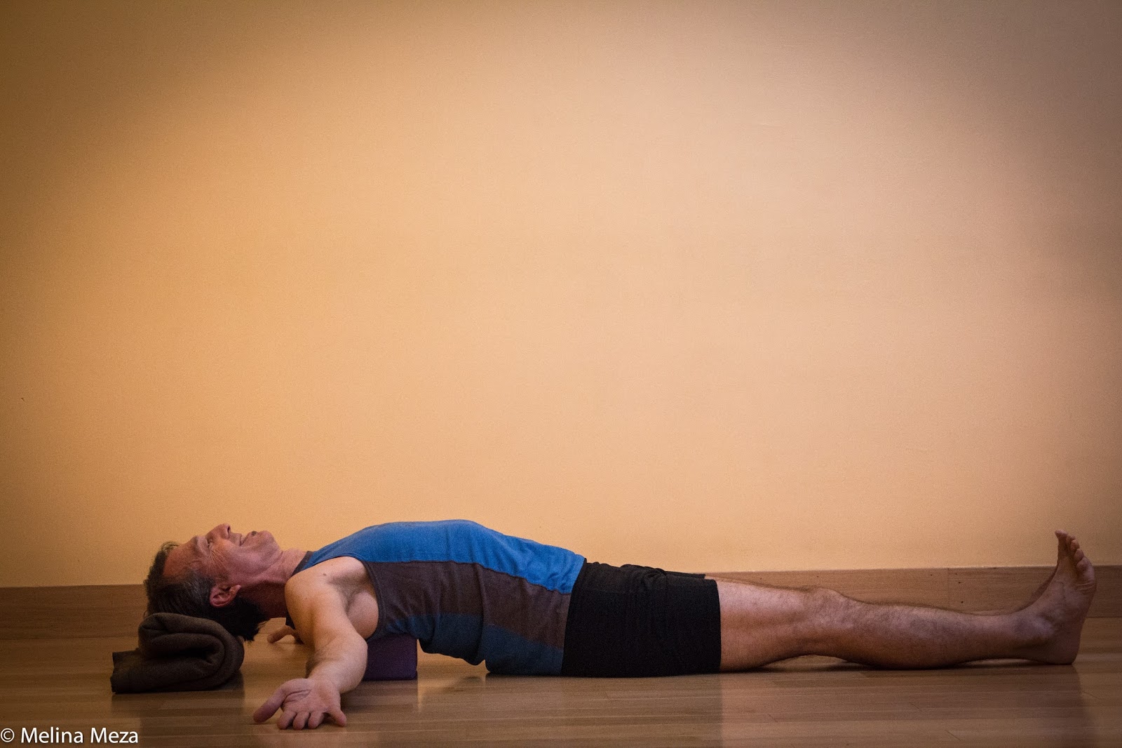 To set up for the pose, place a bolster or thickly rolled blanket crosswise on your mat, about 2/3 of the way towards the back of your mat. If you like, you can add in a folded blanket to support your head. Then, sit down in front of the bolster about one to two feet away from it (depending on your height), with your knees bent and your feet on the floor. To come into the pose, use your hands to guide yourself back and down onto the bolster, arching your spine to bring your head down onto the floor just beyond the bolster. The bolster should support your upper back, with the lower tips of your shoulder blades on the center of the bolster. The tops of your shoulders should hang towards the floor but not rest on it. If necessary, shift yourself forward or backward to achieve this alignment.Next, bring your arms straight out to your sides, just along the top edge of the bolster, so the back of your hands, and maybe your elbows, rest on the floor. You can keep your arms straight or bend at the elbows into a Cactus position (as shown in the photo). Finally, straighten your legs along the floor. Firm your leg muscles and draw the balls of your feet back towards the tops of your shins. When you have finally aligned yourself in the pose, release the weight of your upper body onto the support and bring your attention to your breath. Breathe comfortably for 6-12 breaths and then try to deepen your breath for 6 additional breaths. Gradually work your way up to longer holds, eventually holding the pose for up to 3 minutes.To come out of the pose, bend your knees and place your feet on the floor. Then roll off the props onto your side, and slowly come up to sitting. 2. Arms Overhead(Sorry, no photo) This is a great version if you want to get even more opening of your thoracic spine and the long axis of your front body, as well as improving the range of motion of your shoulders. It is especially helpful for warming up for backbends or standing poses where your arms are overhead.Come into the classic version of the pose as above. Next, take your arms straight up towards the ceiling and actively reach upwards. Then slowly take your arms overhead, reaching more for the wall behind you than for the floor. Press your heels forward and reach your hands back at the same time.Take 6-8 breaths in this extended position, gradually working your way up to longer holds, eventually holding the pose for up to 3 minutes. Then on an exhalation, bring your arms back up toward the ceiling and then out to your sides and to the floor. Exit as for the classic pose.3. Block and Head Support
