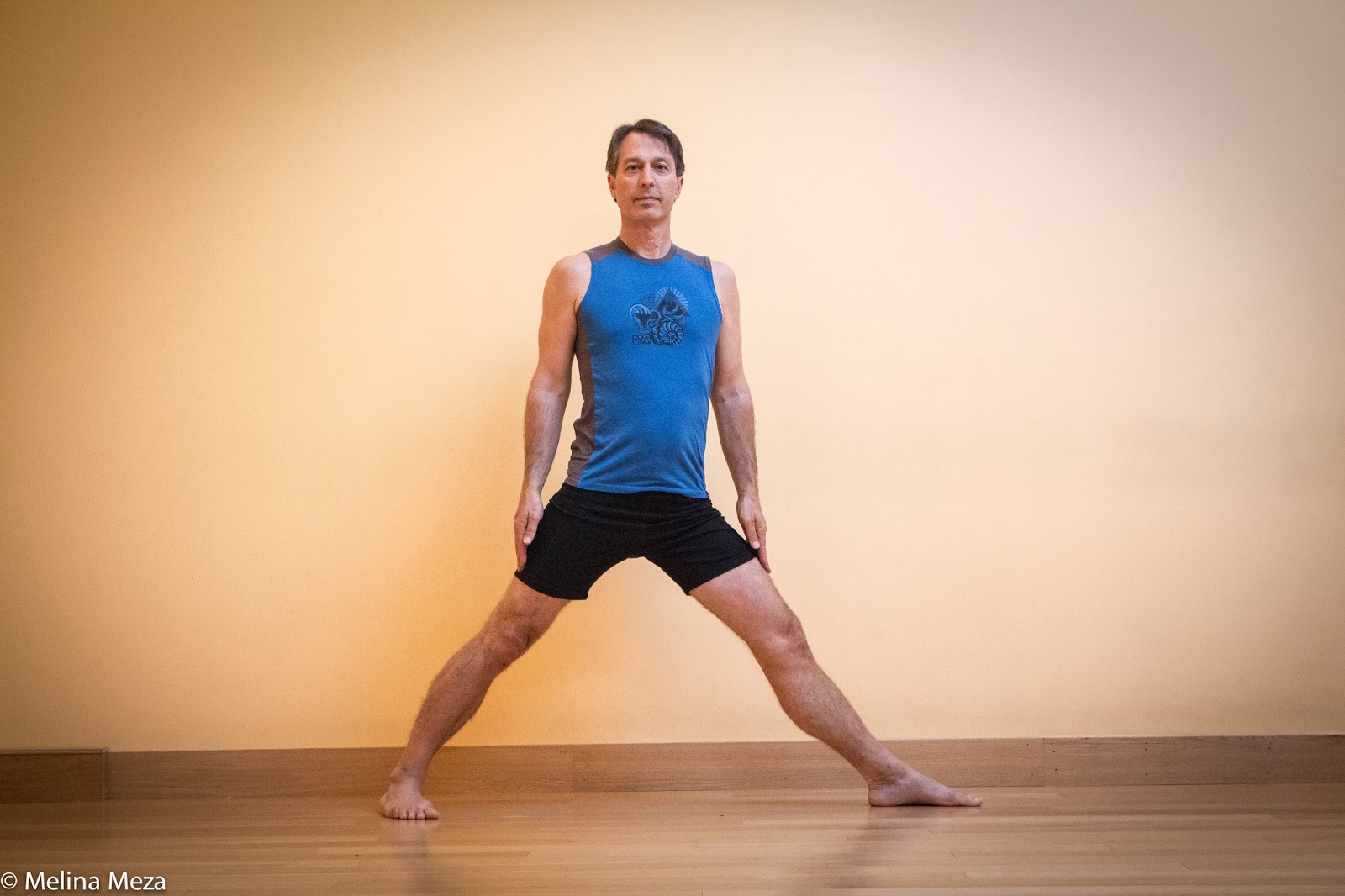 Instead of stepping the feet as wide as classic Warrior 2, step your feet only about three feet apart. Then adjust your front and back foot as in classic Warrior 2, but keep the hands on the hips, with the shoulder blades relaxed on the back chest.
