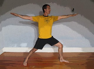 3. Warrior 2 (Virabhadrasana 2): Practice the Sanskrit name of the pose. Then, facing the long edge of your mat, step your feet wide apart so that the outer edge of your left foot is flush against the wall (or only the heel if this is a problem for your hips). Then turn your right foot and leg out 90 degrees, towards the center of the room. Now, bend your right knee and raise your arms to come into the pose. Instead of looking toward your front arm, look back at your left hand as you enter, stay in the pose for 6-12 breaths, and then exit the pose. Turn to the other long edge of your mat and repeat on the second side.