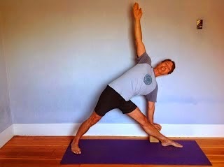 4. Standing Forward Bend with the Wall (Uttanasana): Practice the Sanskrit name of the pose. Now, stand with your back to the wall with your hips and shoulders touching the wall but your heels about 12 inches away from the wall. Bend your knees slightly and then tip forward from your hip joints to come into the forward fold, keeping your buttocks flesh on the wall and lowering down as far as you safely can. Caution: If you have osteopenia or osteoporosis, perhaps come only half way down. Stay for 12 breaths, and come up on an inhalation.5. Triangle Pose (Utthita Trikonasana): Practice the Sanskrit name of the pose. Then, turn around on your mat so you can practice the left side of Triangle pose first. Facing the long edge of your mat, step your feet wide apart so that the outer edge of your right foot is flush against the wall (or only the heel if this is a problem for your hips). Then turn your left foot and leg out 90 degrees, towards the center of the room. Next, inhale your arms up to parallel with the floor, and keeping your attention on your left hand, come into full Triangle pose, using a prop for your bottom hand if necessary. As you stay in the pose for 6-12 breaths, keep looking at your left hand (your bottom hand) and continue to focus on your left hand as you come out of the pose. Then turn towards the other long edge of your mat and repeat the pose on the right side, following your right hand as you move into, stay in, and move out of the pose.Imagine the Wall!