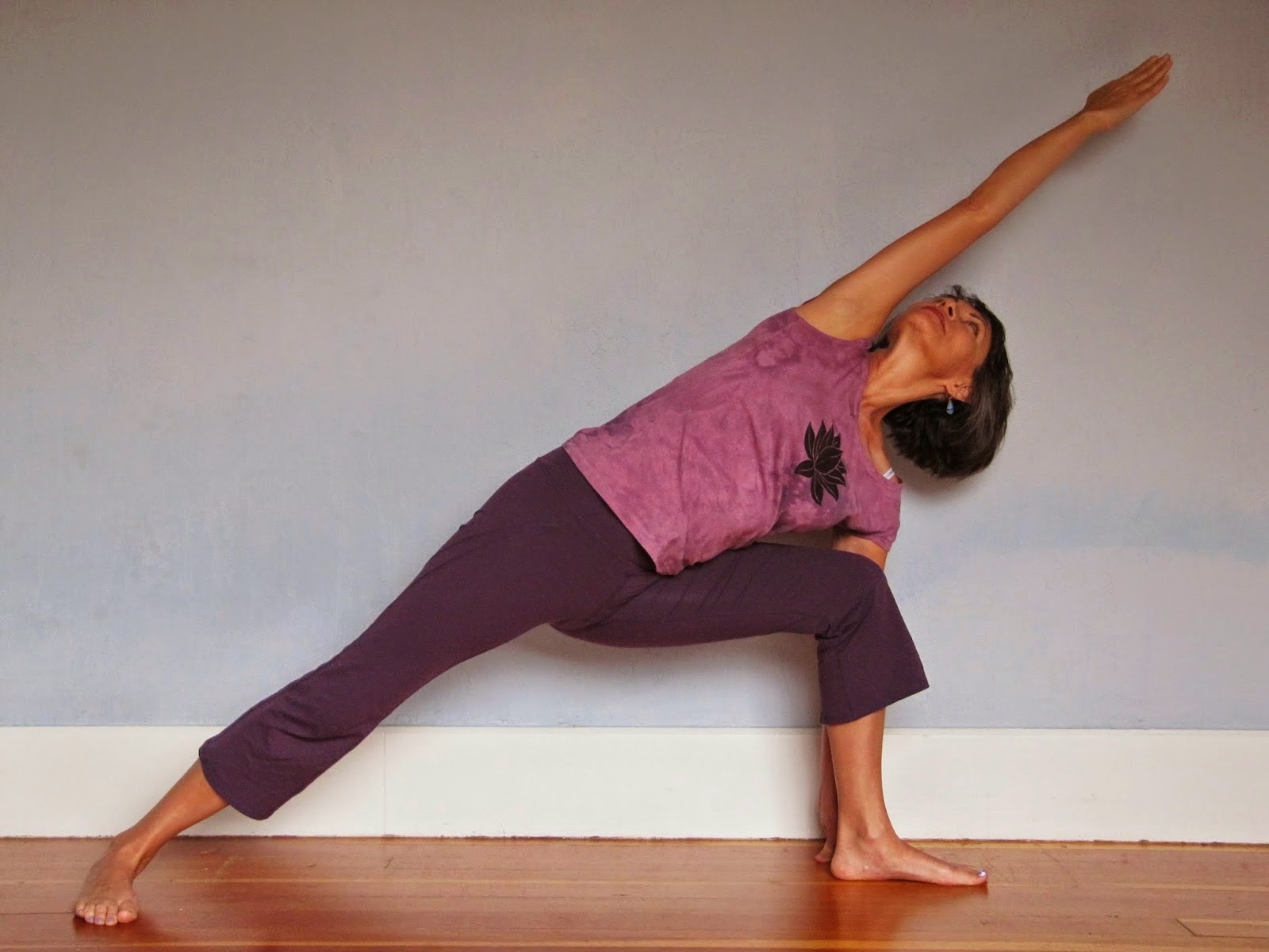 To come into the pose, start with your right side to the wall, and reach your right arm out to your side, parallel with the floor, and place your palm on the wall with your fingers pointing up. Engage your right shoulder blade into your chest wall and down slightly towards the right side of your waist. Then, step both feet out away from the wall, until your right foot is positioned directly under your left shoulder. If your balance is good, try bending your left knee and bringing your left foot into Tree pose. Then take your left arm up and overhead, reaching strongly towards the wall with your left arm and shoulder blade, aligning it like the top arm in Extended Side Angle pose. Stay for 6 breaths and work up from there. Repeat on the second side.