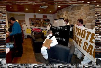 According to the Forest Service complaint, the fire department and a hazmat team were called to address a potentially hazardous spill of clear liquid that had flooded the Forest Service lobby floor after protesters exited. An unknown individual allegedly tipped over a 5 gallon bucket full of what the hazmat team determined to be treated sewage effluent.