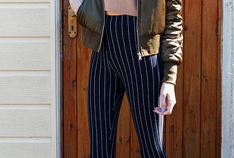 I love comfy casual outfits, I wore this to travel to Somerset for my sister’s wedding and as it was a long drive I wanted something comfortable but fashionable and this was perfect! The camel lace up top looked perfect with the nude trainers and I paired the pinstripe leggings for added style, I then threw on this bomber jacket to finish off the look, and I also wore the gray New Era cap as they just look good :-)