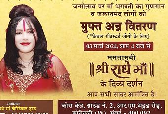 The Shri Radhe Charitable Trust Mumbai and Shri Radhe Charitable Society New Delhi have organized a grand event on the occasion of Shri Radhe Maa’s birth anniversary on March 3, Sunday, at Kora Kendra Ground, Borivali West, Mumbai, 4 pm onwards. Inspired by the teachings of Shri Radhe Guru Maa, devotees have established these trusts, Shri Radhe Guru Maa Charitable Trust (Mumbai) and Shri Radhe Guru Maa Charitable Society (New Delhi). These trusts have been devoted to various charitable activities, including donations of clothes, food grains, notebooks, computers, sewing machines, wheelchairs, and more to those below the poverty line and the underprivileged. Medical camps, blood donation drives, eye check-ups, dental camps, and support for various social organizations are integral parts of their philanthropic endeavours.