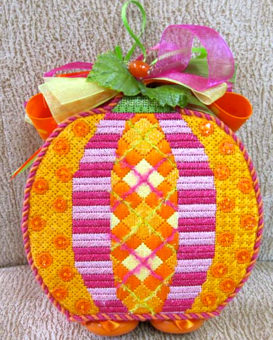 And this quick stitcher has gotten a pumpkin from the Crazy Patch back from the finisher with plenty of time to spare for Fall decorating! Love all the cute details added such as the little feet and the silk leaves. Thanks to Louise's Needlework for the photo.