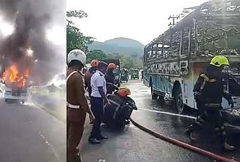 The police say that the bus which was carrying passengers from Ratnapura to Panadura has stopped at the bus stop in front of the Horana Boralugoda Investment Promotion Zone and resumed its journey after picking up the passengers. Fire has broken out at this point after emitting smoke from the front of the bus.