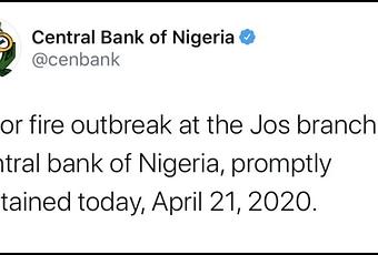 A statement signed by the Bank’s Director of Corporate Communications, Isaac Okorafor, indicated that at about 9.15 a.m., on Tuesday, April 21, 2020, the fire alarm in CBN Jos Branch was triggered and in line with the Bank’s fire drill and protocol, the skeletal staff on essential duty were promptly evacuated from the building to the muster point.