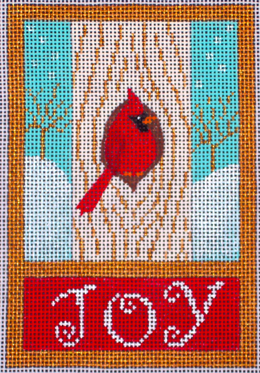 I had to call this one "It's a Mod, Mod Christmas", but several people have told me that not only is this an overall pattern design that could be appropriate for all year, but with a simple color change it would also be a great design for Hanukkah. This is 7.5" x 9" on 18 count.This little fellow snuck into the mix somehow, probably because I have cardinals on the the brain as I am lucky enough to have a whole flock of them at my feeders every day. I posted this on my Facebook page and he quickly became the winner of "viewer's choice" with the most comments of any of the designs. Guess a lot of you also love cardinals, and I think I see some more cardinal designs in my future as well! This is a small canvas, 3.5" x 5" on 18.I was also in the mood to paint florals too and added four new ones into the line:This is White Peonies, 8" x 8" on 18 count. I am really into this aqua color, it seems to be everywhere these days!And this is Rose and Butterfly (clearly I was stumped for whimsical titles this season!) and it is 6" x 6" on 18. Orange, pink and brown is a color scheme I continue to be obsessed with-- the dark chocolate color on the butterfly is a regular brown paint, but the other browns are actually several different shades of dark gold metallics, which give the canvas a nice sparkle that doesn't show up well in the photograph.