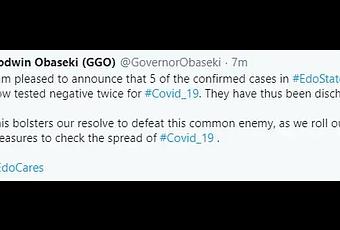 ”I am pleased to announce that 5 of the confirmed cases in #EdoState have now tested negative twice for #Covid_19. They have thus been discharged. This bolsters our resolve to defeat this common enemy, as we roll out more measures to check the spread of #Covid_19.” he tweeted