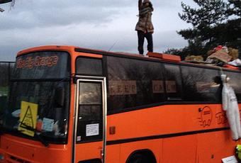 Five Brave Barton Moss Protectors are locked to a big orange bus preventing access to IGas’ site.