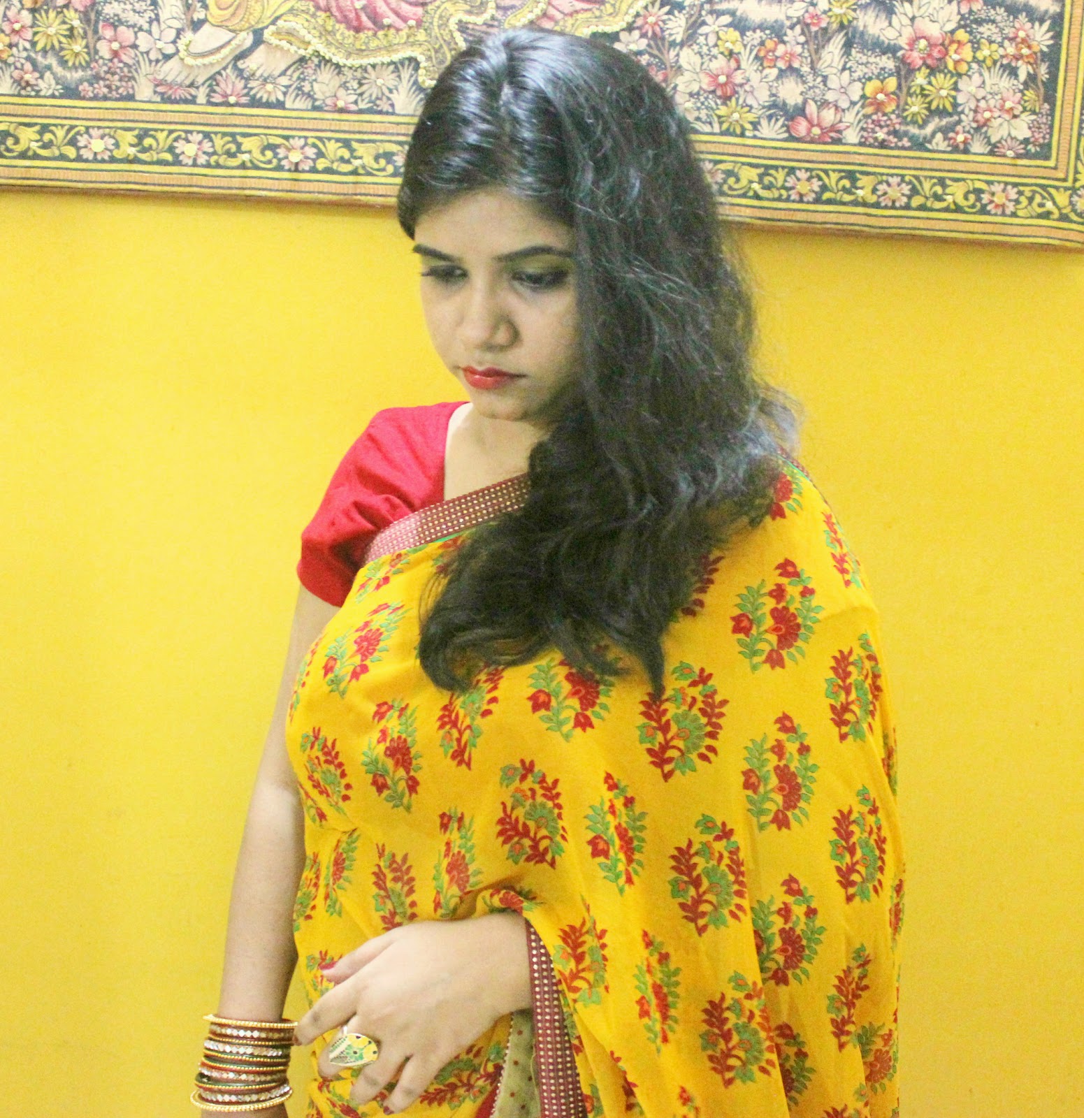 Saris are something that I don’t prefer for all occasion and take them out of my closet for some very special event like wedding, parties etc. But receiving a beautiful red and yellow floral saree from "Triveni Ethnics Summer Collection" was a true surprise!!! Thus, just couldn’t wait to do an OOTDwith this summer saree in so fresh colours.A bright yellow Georgette saree with red and green fun floral prints makes it a perfect summer wear. The soft and very light fabric of this saree can accentuate any figure and give graceful and elegant look.