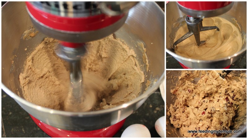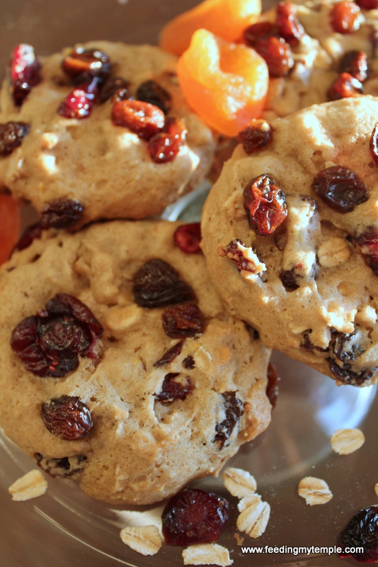 2 1/4 cup all purpose flour 1 1/4 teaspoon baking powder 3/4 teaspoon baking soda 3/4 teaspoon cinnamon 1/2 teaspoon nutmeg 1/4 teaspoon allspice 1/4 teaspoon salt 1 stick unsalted butter, room temperature 1/2 cup packed brown sugar 2 large eggs 1/4 cup honey 1/4 cup Greek yogurt 1/2 teaspoon ginger powder Zest of 1 lemon 1/2 cup old fashioned oats 1 1/4 cup dried cranberries 1 1/4 cup raisins 1/2 cup walnuts 1/4 cup dried apricots, dicedPreparation: