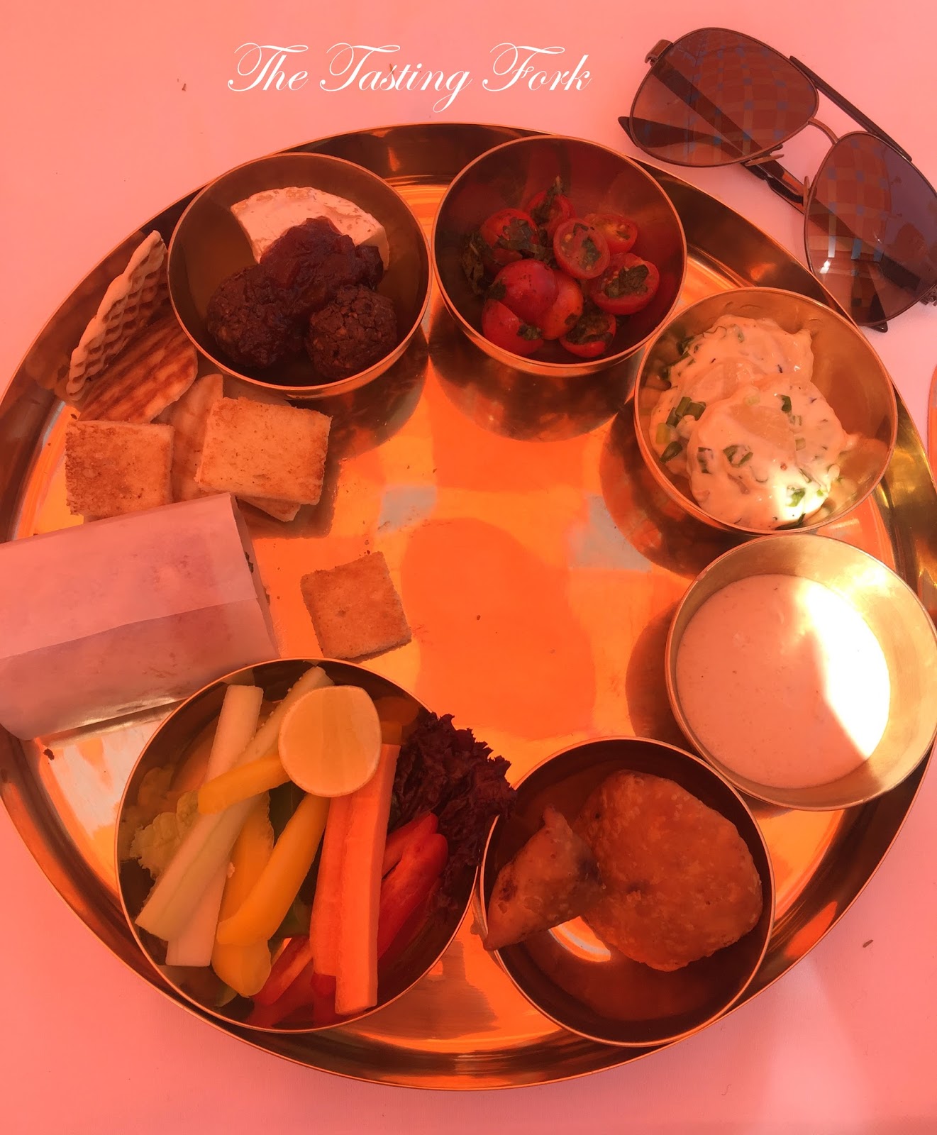 We were served a thali with all the food in it. Spice rubbed chicken served by the servers to us before the thali, while we sit and enjoy our drinks. The thali had a few dips and crackers. Pita, babaganoush, cream cheese dip and the likes. A fresh tomato salad with some greens, a marvelous potato salad lathered with creamy mayonnaise with a touch of mustard, sliders of your choice (I took the yummy chicken patty and basil), and Pilaf which is a rice dish with chicken. Everything on the plate was made with such finesse, and the presentation and exotic vibe of having all this in the middle of the desert just feels all the more unreal. Delicious food with free-flowing cocktails or drinks straight up at your service, and you enjoy the cool vibe of the place. If it sounds amazing, you cannot even imagine how amazing it actually feels. Unreal!!Thar Dinner at Celebration Garden