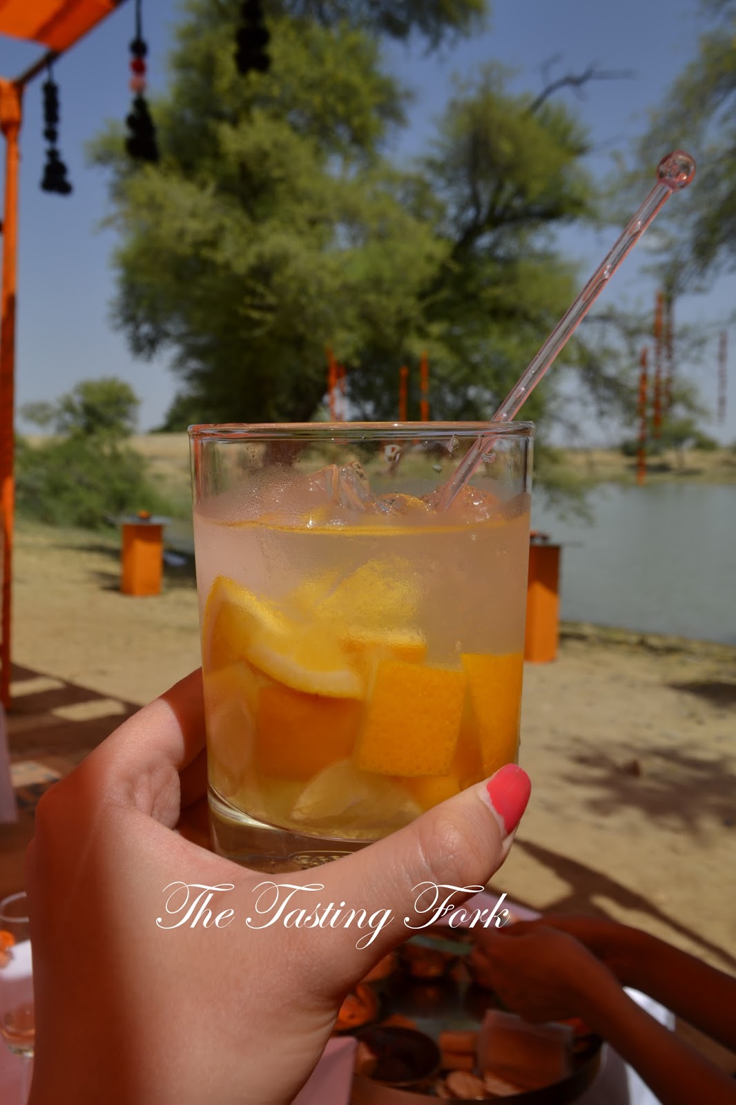 On our second day we got a tour of the Thar Desert where the silk route trading happened and through which people passed during the silk route and carried on business. We saw different bird and trees that could survive in such an environment and also paid a visit to a temple situated here. The return from the temple had us stop beside an oasis, where we were surprised and in awe to see the most beautiful setup for lunch. Sheds in hues or orange and yellow with tables laid with cutlery, a bar set up in one corner, equipped to make almost any cocktail you asked for, a person playing the flute for us, and all this in the middle of nowhere! The seating of this lunch was every bit royal- with cushions and sofas, and a menu that was purely continental. Imagine having continental food in the most impressive cutlery, sitting beside an oasis in the middle of Thar, sipping on your vodka and orange based cocktail. The feeling of this sinking in while you’re experiencing it is very difficult. It’s almost like this isn’t possible. But Suryagarh makes it happen for you. No compromise with the quality of the food and drinks, no compromise with the kind of seating, the service, the cutlery, or the warmth in their hospitality. Extremely impressive!