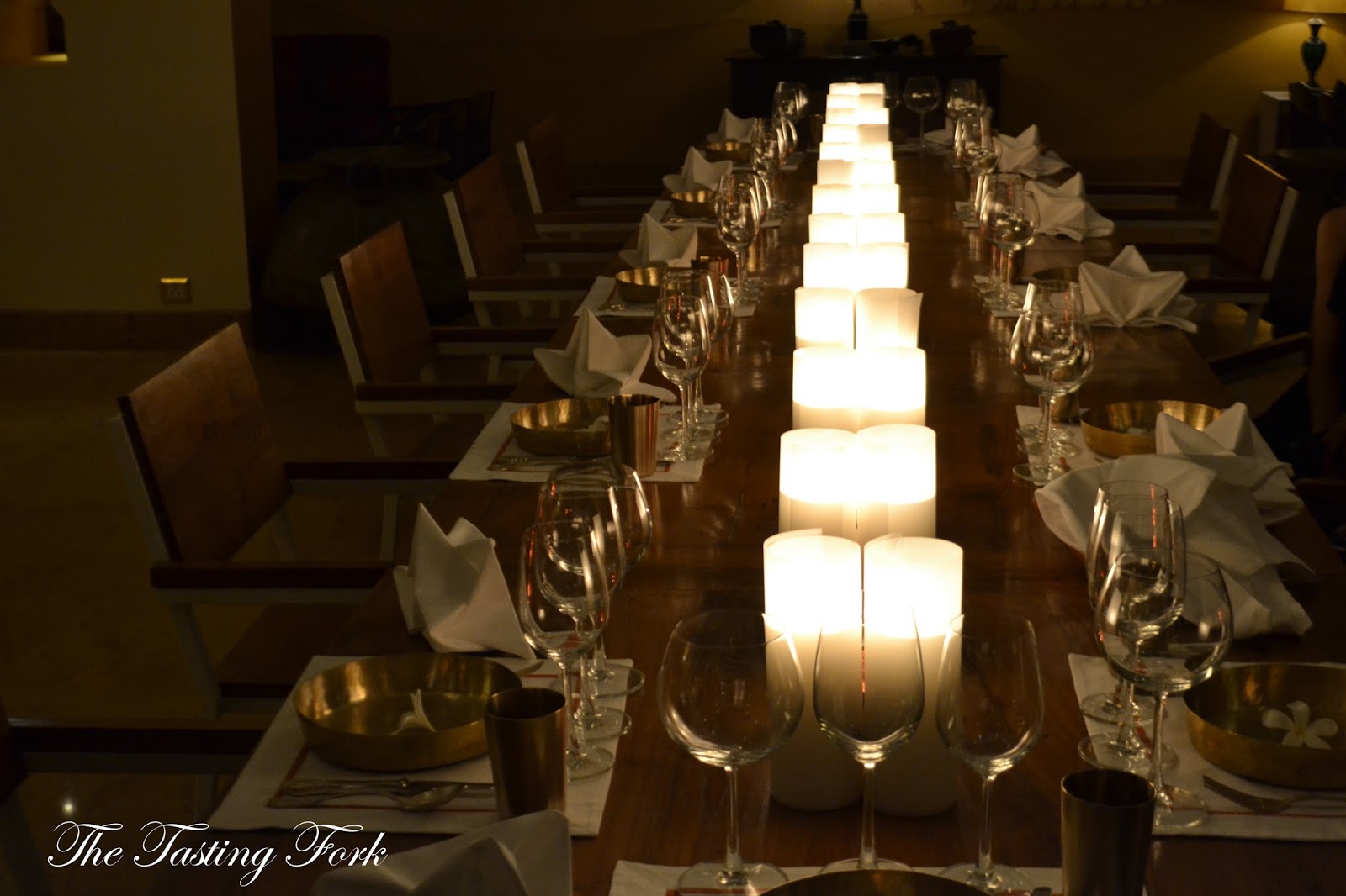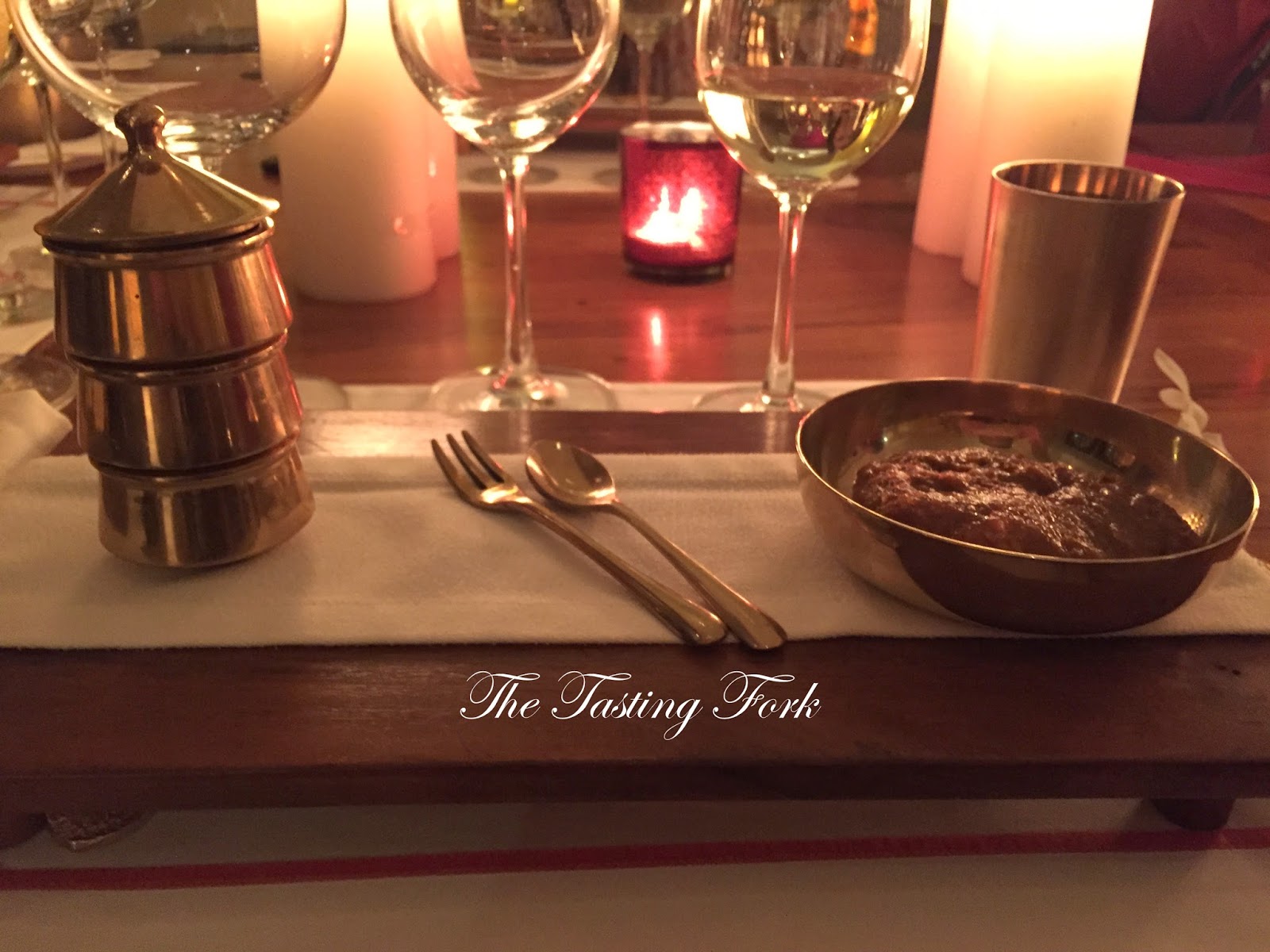 My first night at Suryagarh saw cocktails and dinner in their bar, called Draksh. Tables lit up with small candles, cutlery set up in the most royal way, for a Suryagarh Thali experience. Started off by getting some drinks from the bar and enjoying our appetizers- Dahi Ke Kebab and Pathar Kutta Gosht. The Dahi Kebab was coated with sago and was very crisp. But the Pathar Kutta Gosht was the winner for me. Hand pounded goat meat coated in a thick gravy masala consisting of strong aromatic flavours of cardamom and cinnamon, served with three accompaniments- walnut chutney, garlic chutney and ker pickle. Ker, a specialty of Rajasthan had a nice sour tinge to it, but the rich walnut chutney was my favorite pick. Came in such cute little cutlery!