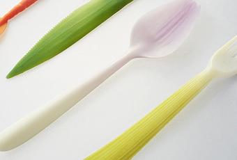 The delicately crafted design of each piece serves as a reminder of the biodegradable materials used to create them: a celery stem becomes a handle for a fork, a stalk of fennel becomes a knife, a slender carrot a spoon.
