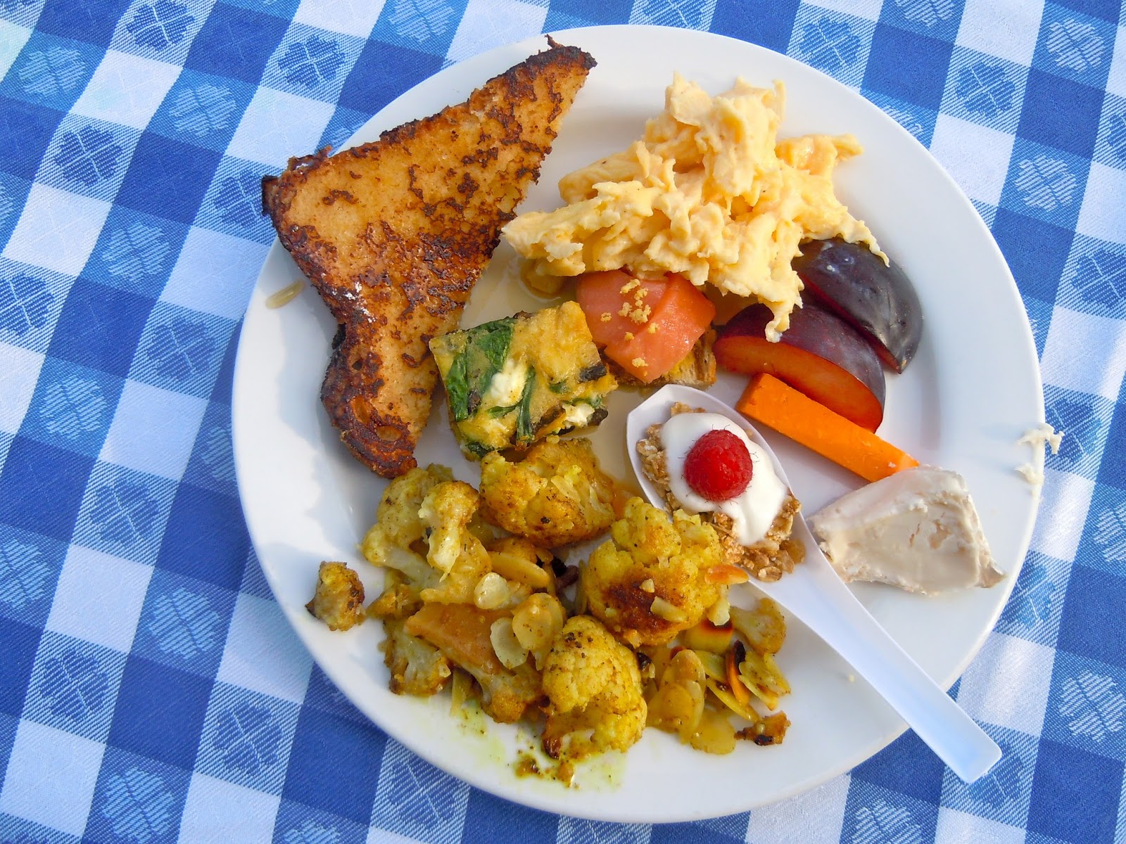 Then, I stocked my plate with challah french toast, goat cheese frittata, scrambled eggs, fruit, a spoonful of granola, and my favorite, Sinhi Breakfast Daal (curry roasted cauliflower and crispy almond slivers). And I had seconds. Delicious.