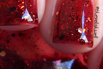 Ira / Wrath. Three coats. A blood red jelly with a mix of red, gold (looks rose-gold because of the red base) and black glitters of various sizes.