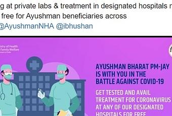The Health Minister tweeted, ‘Over 50 crore poor and vulnerable citizens will be eligible for free corona screening and treatment under Ayushman Bharat. Testing in private hospitals and treatment in designated hospitals has now been made free to Ayushman beneficiaries across India.