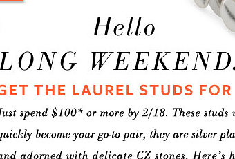 These beautiful Laurel studs are free when you spend $100. Add the Laurel studs to your cart, and the discount will be automatically applied. Through February 18, 2013