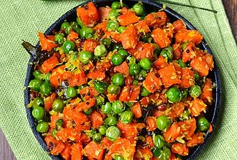 Ingredients: Green Peas - 1cup Carrot - 2 medium, peeled and diced Green chilies - 1~2, finely chopped Ginger - ½" piece, finely grated Chana dal - 1tsp Urad dal - 1tsp Mustard seeds - 1tsp Cumin seeds - 1tsp Curry leaves - 8~10 Dry red chili - 1~2 (optional) Turmeric - ¼tsp