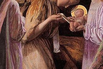 This has always been one of my favorite images of the nativity. It lacks the beauty of Burne-Jones' epic canvases, or the realistic glory of Marianne Stokes, but for plain straight-out weirdness, you can't beat the girl-only, smallest-stable-in-the-world wonder of Arthur Hughes masterpiece. No-one has any room, it is the epitome of too many people round for Christmas. There are wings and knees and halos all jostling for space. Mary is trying to wrap up her ever-so-small baby but there are people outside and it's impossible. For mid-nineteenth century, this is an amazing use of space on a canvas, and such a powerful image. The body proportions are weird (exactly how long is Mary's thigh?), Jesus is absolutely tiny but it has an intensity that others lack.