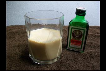 In a shaker over cracked ice, pour in equal portions (1 ounce each) of Kahlua, amaretto, and Jägermeister. Add in 2 ounces of milk. Shake and then strain into an old-fashioned glass with or without cubed ice.