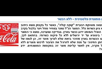 The item states that some coca cola is being sold in Israel with Arabic writing on the label and no kashrut certification symbol at all. These bottles are being sold at a cheaper price.. Upon investigation it has been found that this item is manufactured in the village of Kfar Bitunia, near Jerusalem with no kashrut supervision.
