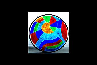 At 63 cm across, its the biggest fused piece I have made and many thanks to Ray Boundy at Glowworm Glass for the hire of his kiln and watching it for me! I kept the color scheme simple and bright and by leaving small gaps between the coloured pieces the design has an orderly segmented feel. I have brought in more flowing, organic feel to the piece by putting a powder between the sheets of glass; this reacts with the glass when heated in the kiln making small bubbles within the 2 layers of glass. I have printed patterns in glass paint on the reverse by drip painting and then sponge printing with transparent paint, this gave the glass lots of texture, helping to disguise the existing patterned glass. The darker red, blue and green areas have been acid etched. To do this I printed small circles onto the glass with PVA glue (using various pen lids as stampers) and the glue acted as a resist to the acid wash, which has frosted the glass.