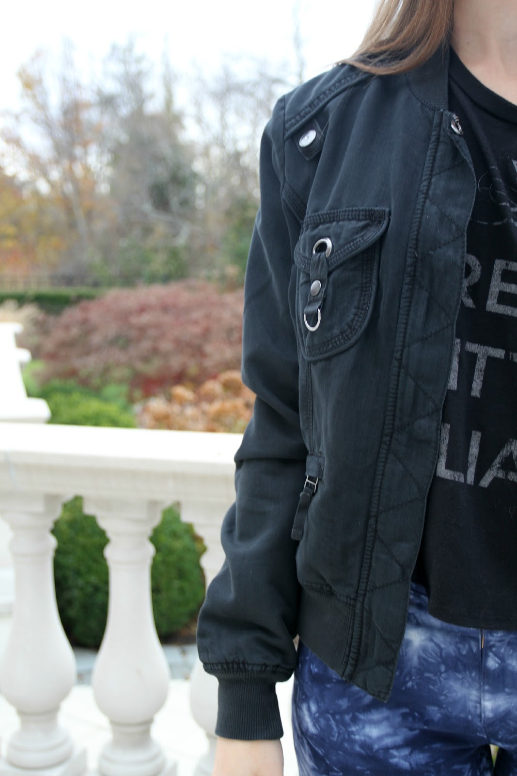 This outfit is nothing but youthful. I have been having trouble matching things other than white tops with these pants. I do admit it is my fault I bought these wild card pants. Anyway, instead of wearing the expected, I kept with the darkness of the bold blue in the pants by keeping my top and accessories dark as well. Not only is the light jacket pictured fashionable, but quite warm as well. I sported this outfit to the movies recently, and kept toasty with this staple.Something I love about the combo of my graphic tee, jacket, and combat boots is they can go with pants as wild as these, or even a simple pair of jeans. Then again, everyone knows black goes with everything.The main reason I bought these pants is because of the comfort of them, as well as the fun factor. I could either wear them out shopping or even a concert/party, which I think it is always exciting to find a piece which is capable of this. When it comes to my accessories, I'd say these boots are quite the statement, which I think finish off the entire outfit better than converse or flats would. P.S. Don't be surprised if you see me wearing these pants......everyday. How do you feel about printed pants? Also, happy Thanksgiving to those of you celebrating!