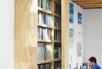 Designed by Jagoda, the door swings open to fit in front of a bookshelf.