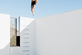 Perched on picturesque Echo Mountain in Phoenix, this Wendell Burnette-designed desert home featured from our Indoor Outdoor issue, comes with a pool that is "half terrace, half cool-water retreat...projected toward the canopy of the desert sky." Enclosed by 13-foot-high white plaster walls, light dramatically filters through the holes that bounce from the water onto the far wall. “One volume gets the city and the valley,” says Burnette, “and the pool frames nothing but sky. There’s a dialog experientially between these two elemental volumes. They talk to each other.”