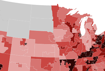 The map above is from Christopher Ingraham in the Washington Post. It shows the most gerrymandered House Districts in the United States. The most obvious gerrymandered districts are those with the darkest color. The states with the most districts that are obviously gerrymandered are North Carolina, Texas, Pennsylvania, Ohio, and Kentucky -- but they are far from the only states with gerrymandered districts. Ingraham used a "compactness" test to determined the districts most likely to be gerrymandered. Here is what he said: