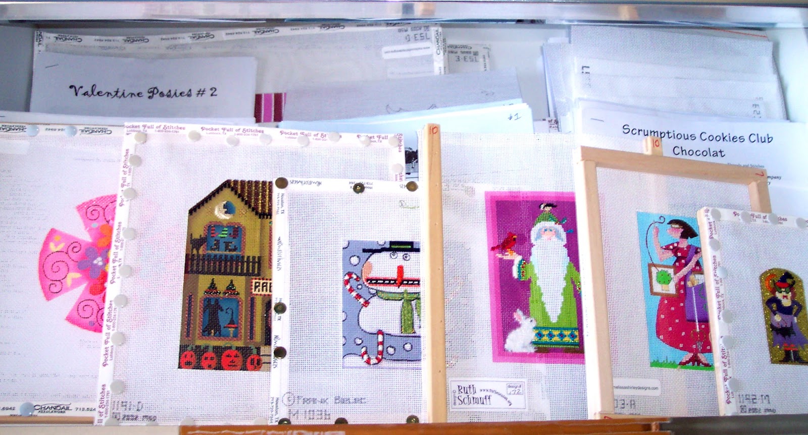 They stacked up along the floor of the closet really nicely, plus they all have casters on the bottom so they are easy to move.At one point, I was participating in so many needlepoint clubs that I had to have a list to keep up with them! Originally, I had each kit in bags stored in plastic tubs, but the canvases and guides started getting wrinkled, so I took the kits apart and put all the stitch guides and canvases in a chest of drawers. I put the work-in-progress canvases in there too: