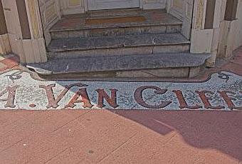 While the town continues to be a popular and attractive resort, most of the original occupants of these stores built at the turn of the twentieth century have gone. However, their presence is still apparent in various forms. Opposite the casino is a reminder of a luxury jewelry store: A Van Cleef, who advertised with this fine pavement mosaic below the steps to their door.