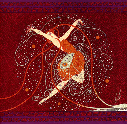 Erte's delicate figures and sophisticated, glamorous designs are instantly recognizable, and his ideas and art still influence fashion into the 21st century. His costumes, program designs and theatrical production sets were featured in the Ziegfeld Follies of 1923.