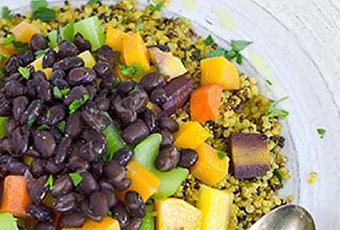 Put the cooked quinoa and roasted vegetables in a large bowl and mix them together