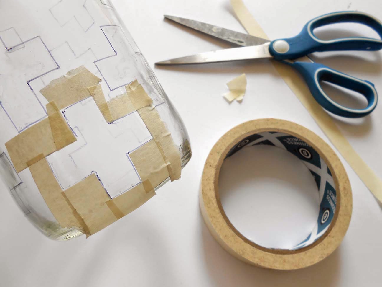 Step 4: Now that your designs are drawn onto the jar you will need to block off the area around your design with masking tape. Lay the tape around the sides of your designs, just outside of the tracing.