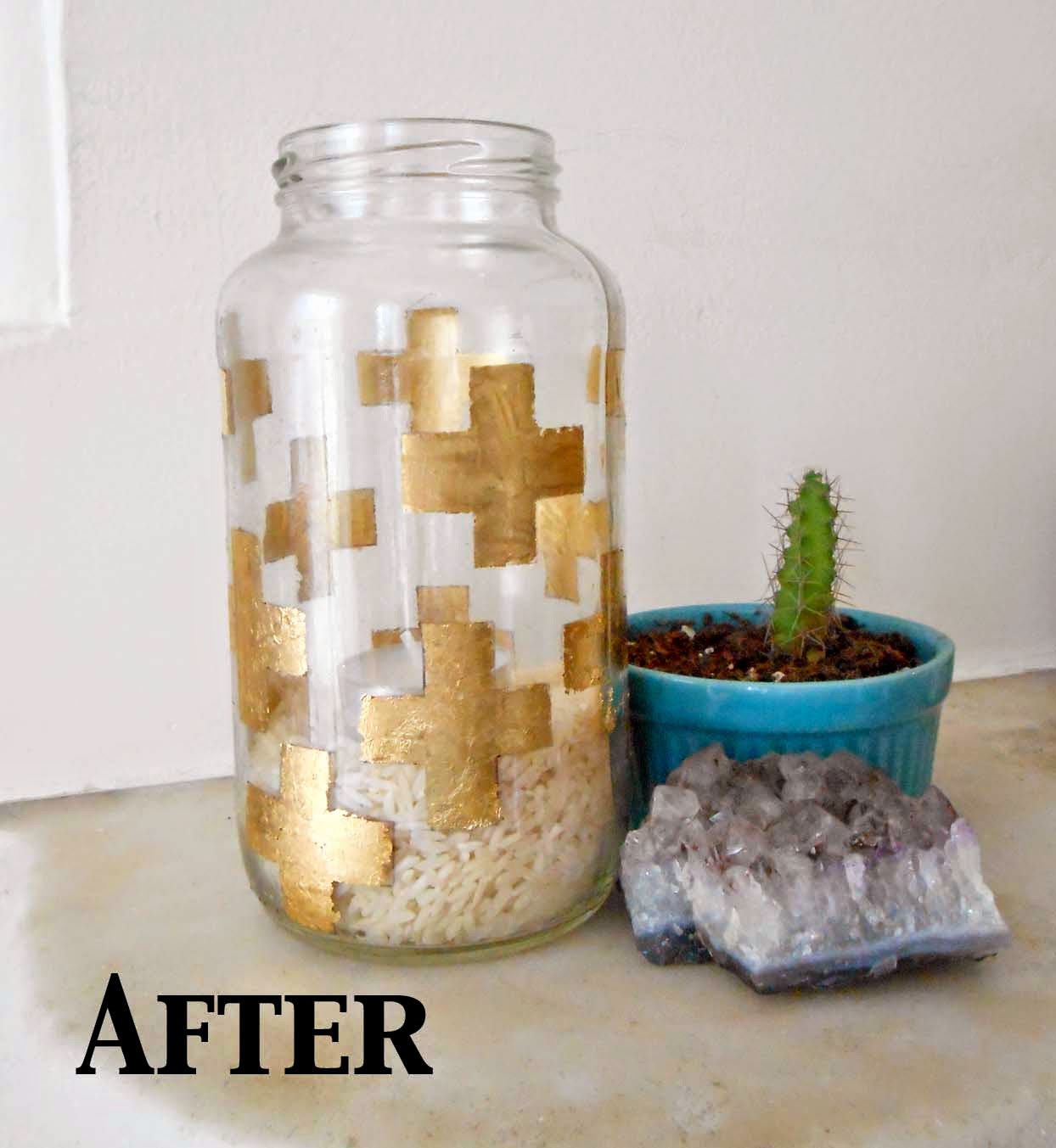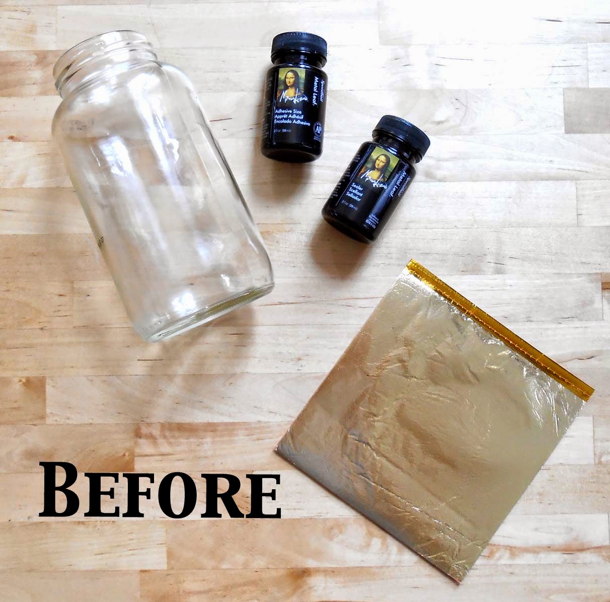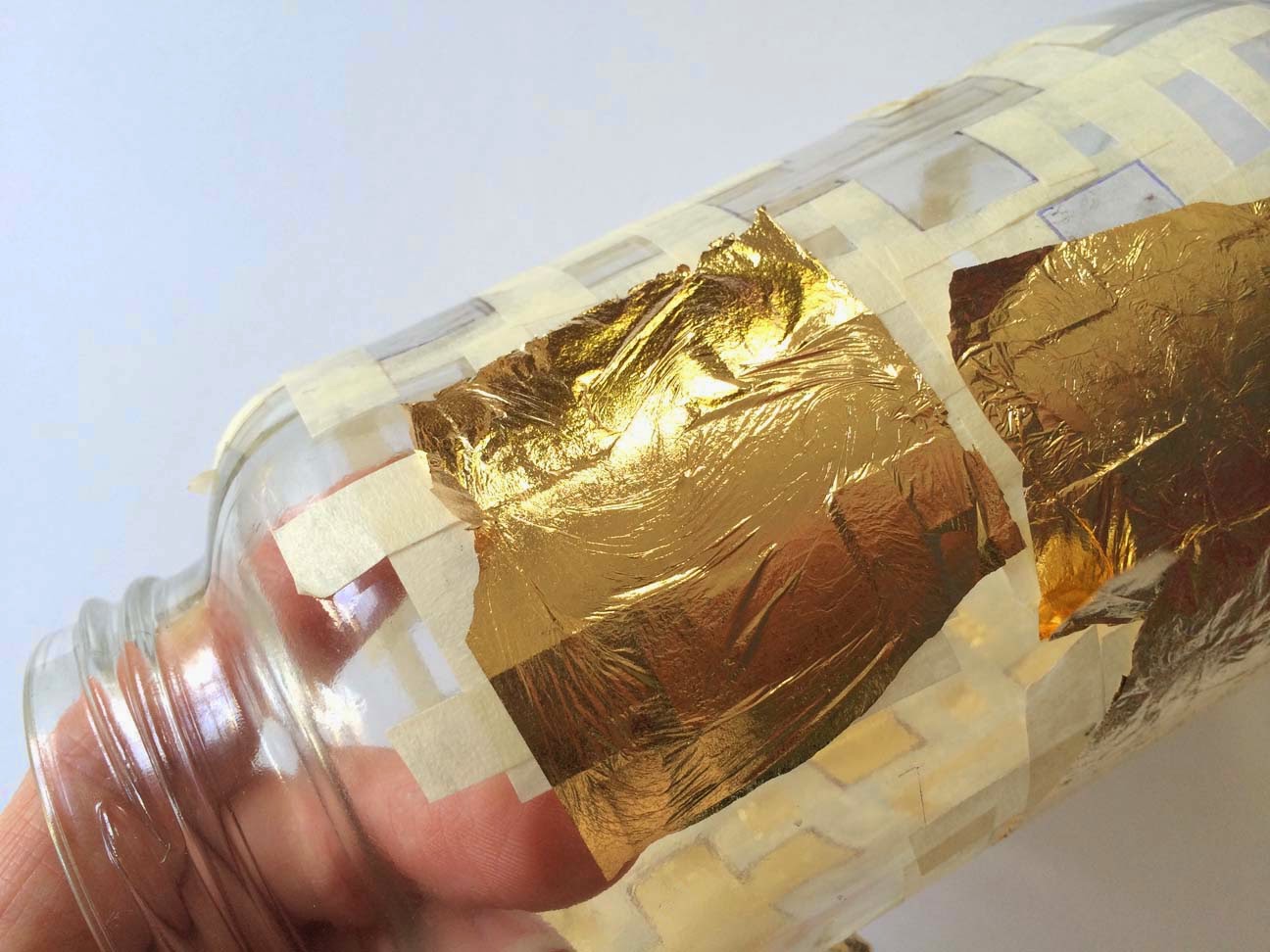 Materials Needed:-clean jar-gold leaf (I used the imatation stuff, but you can also buy 24K as well)-gold leaf adhesive-sealant-masking tape-fine point sharpie