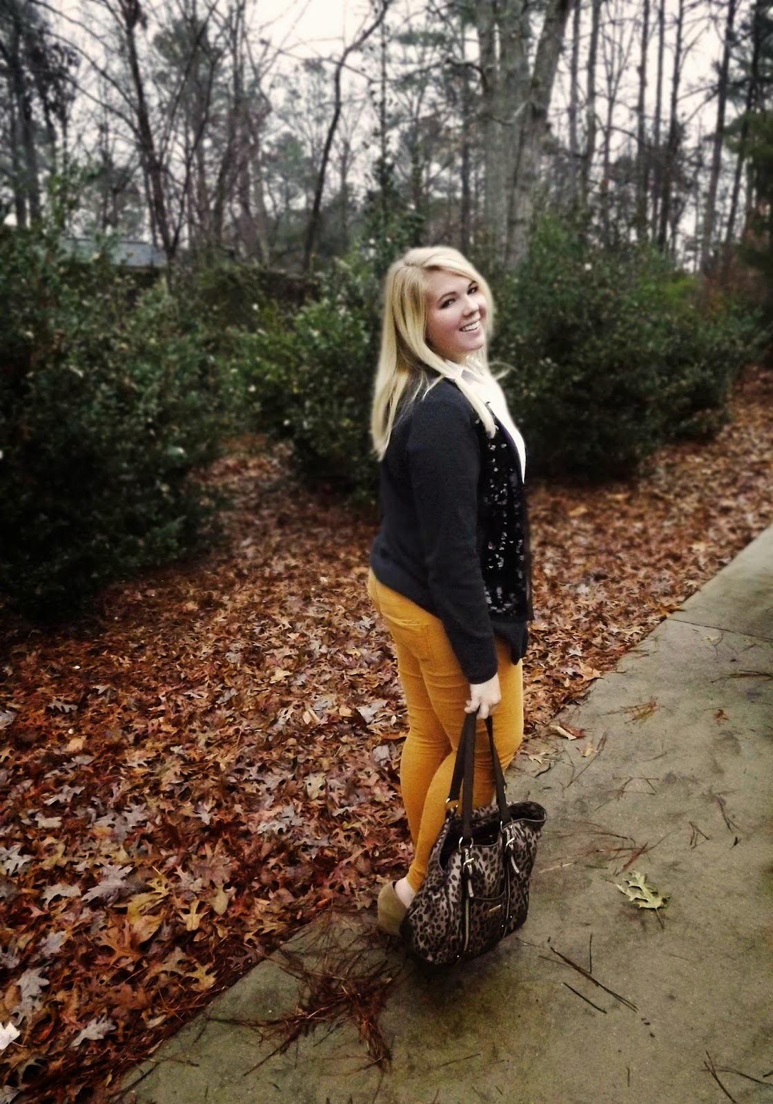 Cardigan- Vera Wang, Oxford- Ralph Lauren, Pants- TJ Maxx, Shoes- Target, Purse- Tommy HilfigerI seriously wish I could wear these shoes all the time! I loved the combination between the corduroy pants and the sequined cardigan. I'm ALL about the sequins these days. If only there were a few more pieces that had classic sequins instead of the tacky over the top ones. Ignore my ghostly appearance, when I stop tanning…I get as white as paper (probably whiter.)xoBCC