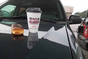 One of my travels, somewhere in Idaho heading for Canada. I stopped at a small town for gas and said hello to a guy in camouflage clothes, looking like a hunter or something like it. He went into the gas station and I put a paper cup of coffee on my hood to shot a photo or two. When camo came back, he opened a carton of donuts, took one out and put it beside the cup and said "gotta get food for the road" and smiled and then left.