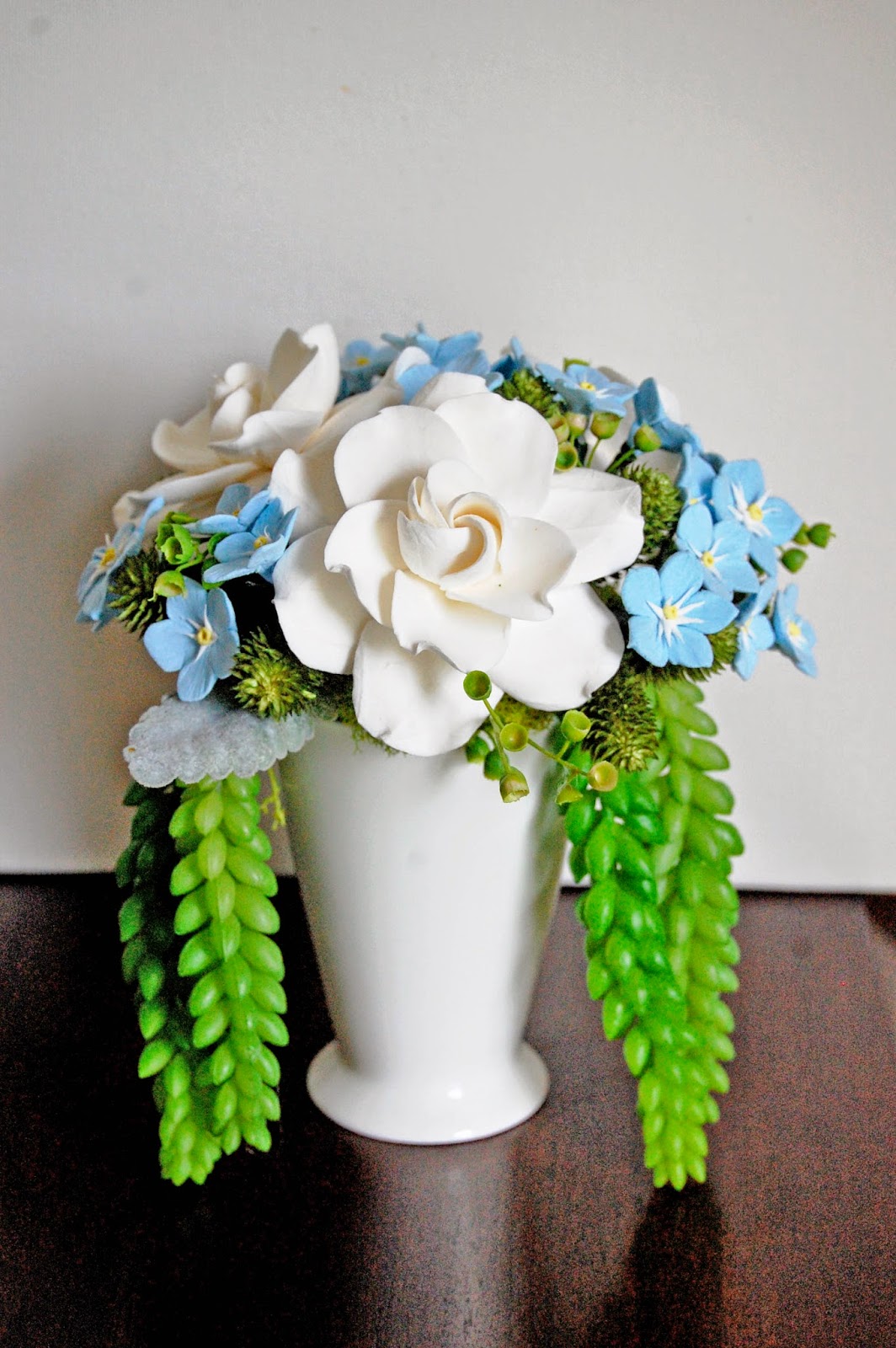 I created a mini teacup arrangement for his mom with handmade gardenias and blue forget me nots, I added some dried berries for a gorgeous coffee table or side table arrangement.