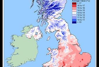 We see that the south coast of England (ignoring the Southampton-Portsmouth urban heat island) is on average 2C warmer than Glasgow or Edinburgh in summer, that's a distance of about 400 miles. Both are at sea level.