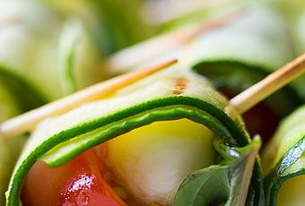 Zucchini ribbons are wrapped around fresh basil, bocconcini, and a cherry tomato, then lightly grilled. A light and fresh appetizer, perfect for a backyard barbecue!
