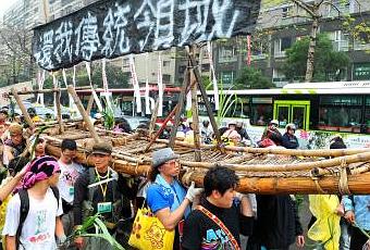 At the head of the parade was an Amis bamboo raft with a banner that read “Return our domain to us,” carried by 20 men, to express their hope to live in harmony with nature.