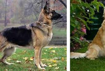 Two dogs — a German Shepherd and a Golden Retriever — compete in a spaghetti-eating contest.