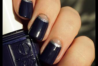 To celebrate her blogaversary, I came up with a cut-out half moon manicure. Initially I had planned to do a water marble manicure I saw on Spektor's Nails, but I failed miserably (several times!). Still I hope you will enjoy this simple yet pretty design. The polish I used is Essie - No More Film, a dusty dark blurple perfect for the Fall season. The silver outlines were done with an Essence striper.