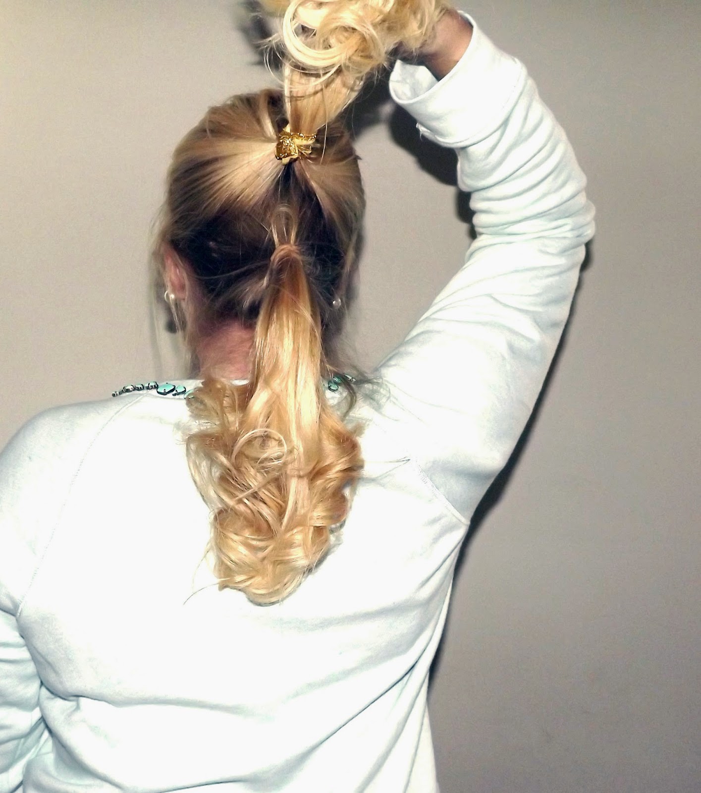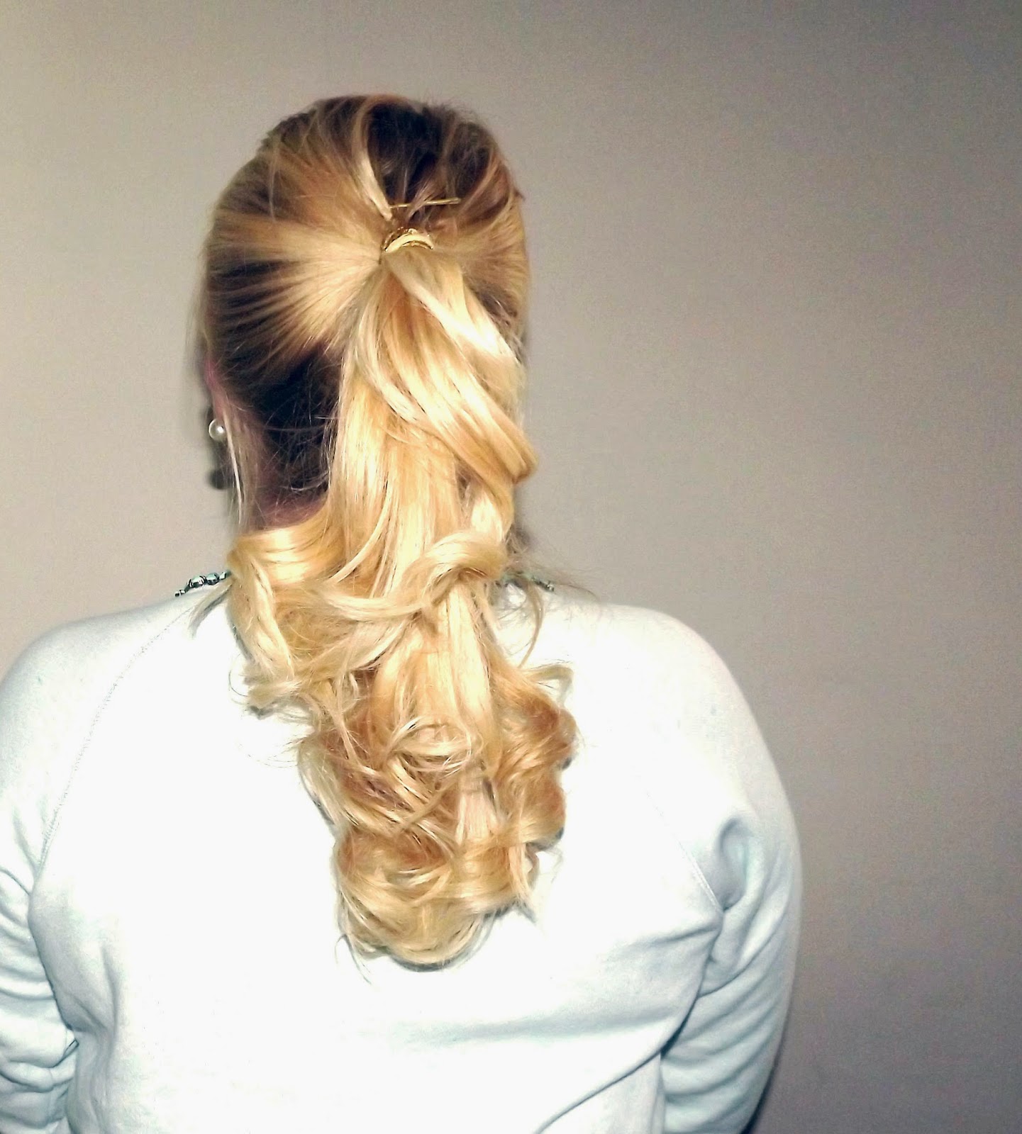 I go through phases where I like to cut all of my hair off and then grow it long again. Obviously I immediately regret that decision once it's done. It makes me miss my long ponytails and adventurous side braids. I have some great news for you ladies that do the same thing: you CAN have your longer ponytail back! It's so simple! Step 1: Curl your hair loosely (no hairspray yet...)Step 2: Section your hair off into the upper layer and the lower layerStep 3: Put the upper layer into a ponytail hairspray that section.Step 4: Place the other section (the bottom section) into a ponytail directly underneath the top one and hairspray.