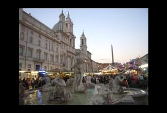 The streets are lit up, the sunset casts fire over the domes of St. Peter and St. John. Radios broadcast some of the Christmas carols, the windowpanes of shops are sprayed with white snowflakes, and the atmosphere is quietly festive. Santa Claus hats can be spotted in the crowd milling around the market of Piazza Navona, among the tables full of treats, handmade souvenirs, and nativity reproductions.